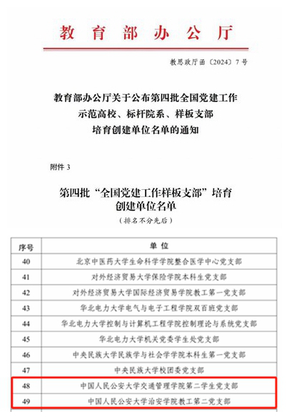 近日,教育部公布第四批全国党建工作示范高校、标杆院系、样板支部培育创建单位名单。经学校党委积极申报,市委教育工委推荐、资格审查、专家推荐,教育部党的建设和全面从严治党工作领导小组成员单位集中审议、结果公示,开云官网治安学院教工第二党支部和交通管理学院第二学生党支部入选第四批“全国党建工作样板支部”培育创建单位,实现了开云官网基层党建工作新的突破。