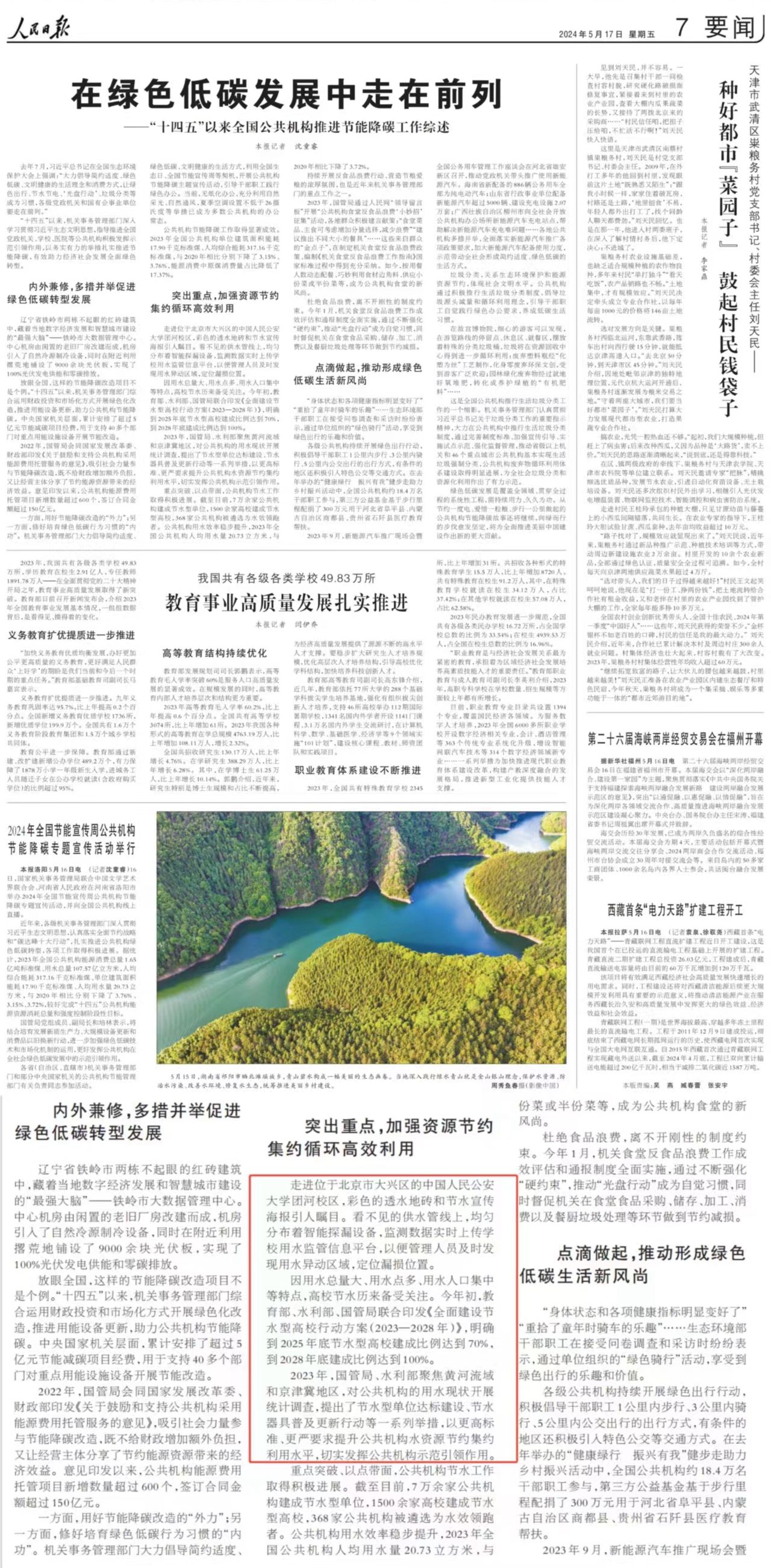 《人民日报》刊发文章《在绿色低碳发展中走在前列——“十四五”以来全国公共机构推进节能降碳工作综述》,文中以开云官网节水工作为例,倡导公共机构以更高标准、更严要求提升水资源节约集约利用水平,切实发挥公共机构示范引领作用。