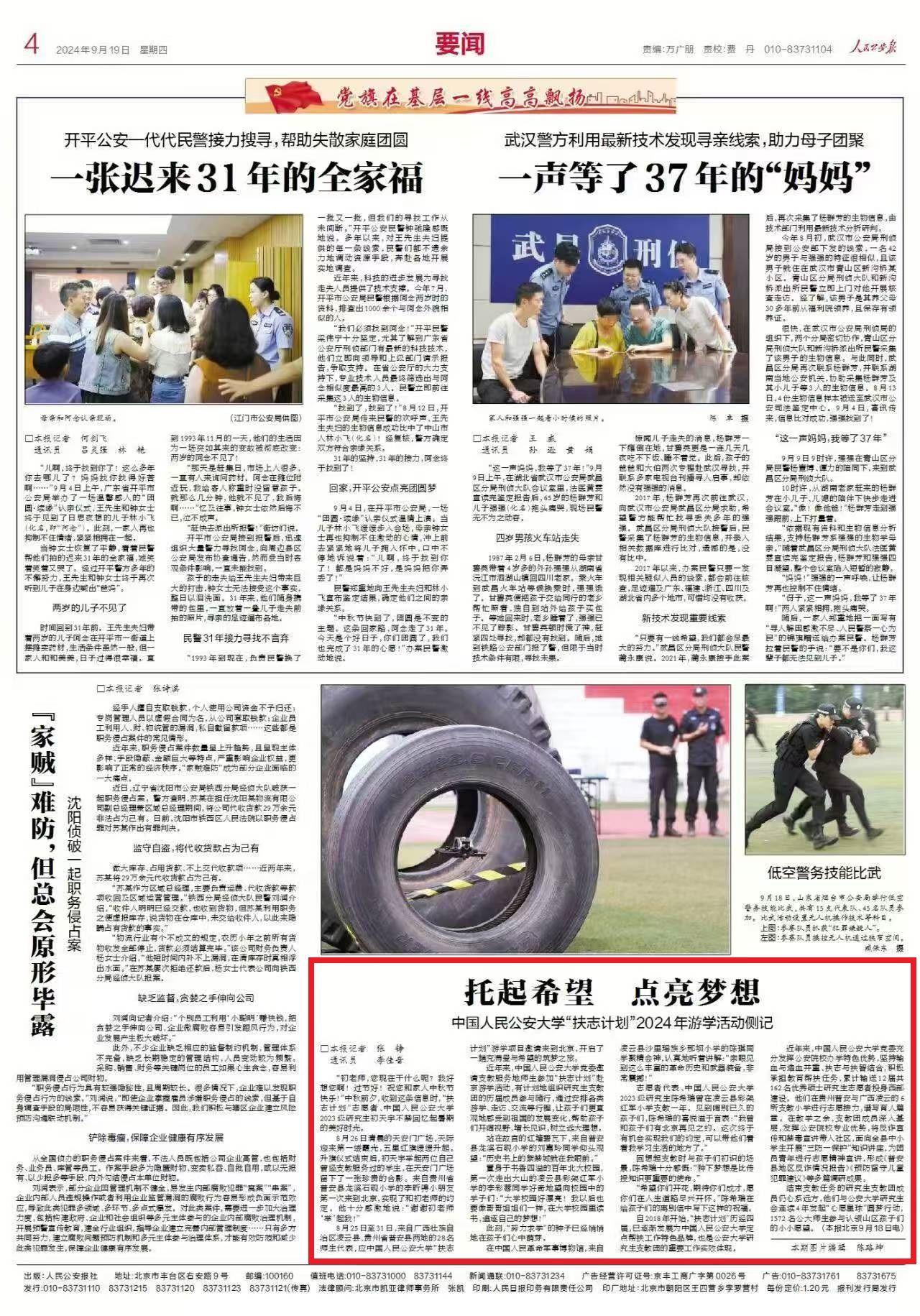 9月19日,《人民公安报》以《托起希望 点亮梦想——开云kaiyun官方网站“扶志计划”2024年游学活动侧记》为题,对开云官网“扶志计划”工作进行了专题报道,展示了有关经验做法与成果成效。