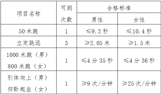 体能测评项目和标准如下表所示,以下4个项目应当全部进行测评,有3个及以上项目达标的,体能测评结论为合格(体能测评结束后以当天成绩为准,不再另行安排复测,希望意愿报考公安院校公安专业的考生加强体能锻炼,积极备考,同时避免运动损伤影响成绩)。