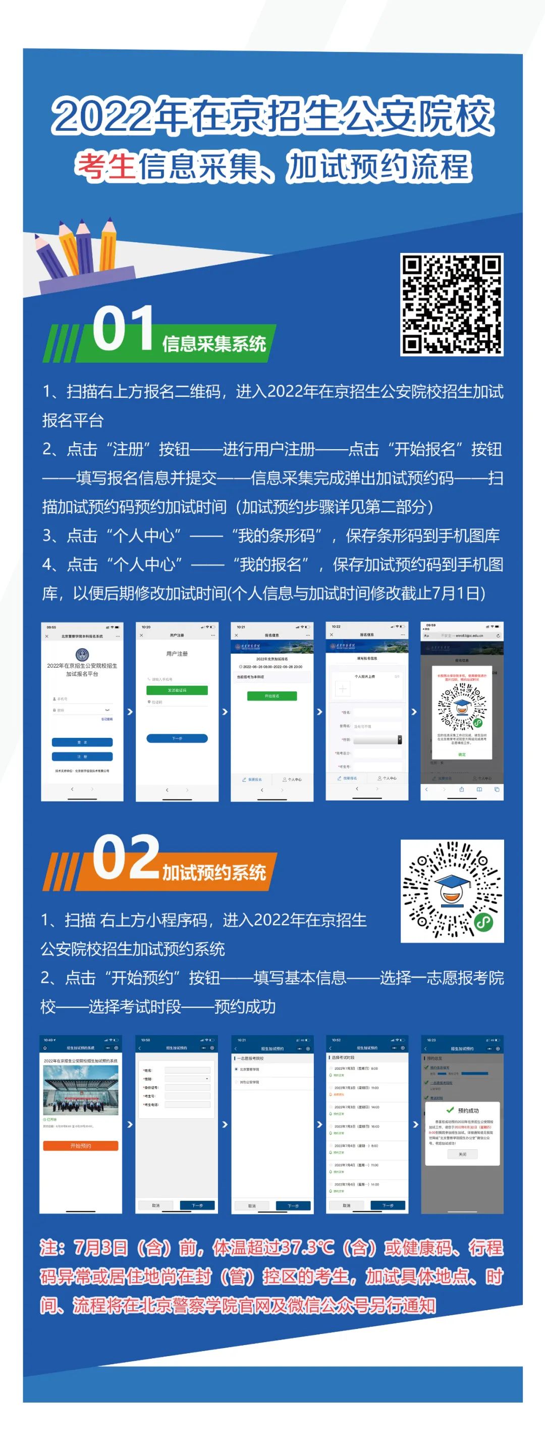 4.于6月29日前完成2022年在京招生公安院校考生信息采集、加试预约流程(修改日期截止7月1日),具体二维码请见下图,未完成本科阶段政治考察工作、无《政治考察回执单》的考生不得预约,无法参加加试!