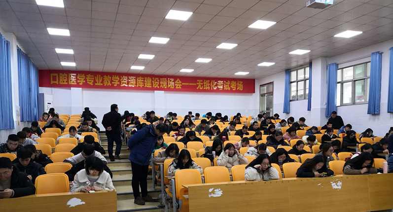 会前,专家组一行到现场巡视了18级口腔医学专业无纸化考试考场。400多名学生参加了此次考试,考生们认真的答题,考场秩序井然,教室的大屏幕上显示每个考生的答题状态。考前一周对考生进行了无纸化试题训练,确保考试环节顺利无误,无纸化考试是资源库建设应用的重要部分。
