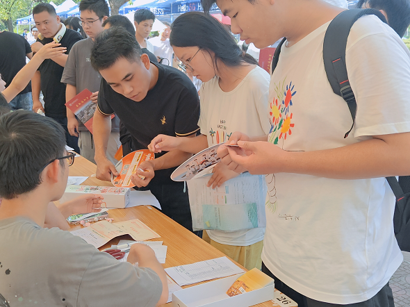 接待处对面,来自蒙古族的学长张硕拉起悠扬的马头琴,来自维吾尔族的学姐凯丽比努尔·麦麦提尼亚孜跳起欢快的舞蹈,这都是为了让学弟学妹们感受到学院的热情,熟悉的民族旋律与舞蹈吸引了众多新生驻足欣赏。悠扬琴声与轻快舞步相映,专业元素与多元文化交融,让新生在热闹中感受到学院的满满诚意与温暖。