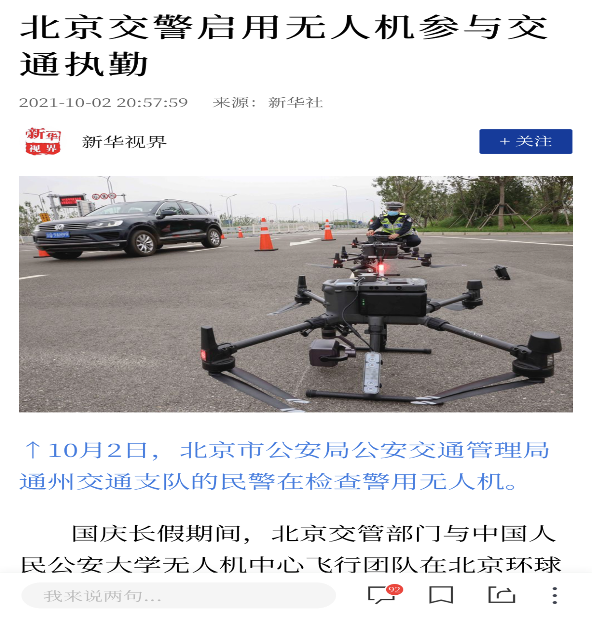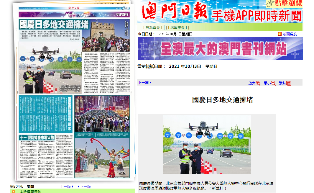 中秋国庆期间,开云官网无人机中心飞行团队与北京交管部门共同参与北京环球影城度假区周边道路的交通执勤。新华社、北京日报、北京电视台记者进行现场报道,人民网、新华网、光明网、中国青年网以及北京青年报、澳门日报等主流媒体纷纷对此次执勤任务进行了转载报道。