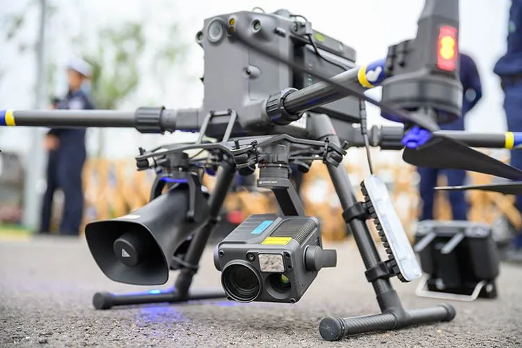 此次使用的警用无人机配备喊话器、夜视仪、爆闪警灯等外挂设备,能够满足道路巡查、交通疏导、安全宣传等多项教官警务工作实战需求,指挥中心可根据无人机实时回传的影像,精准调配警力,实施远端分流疏导。