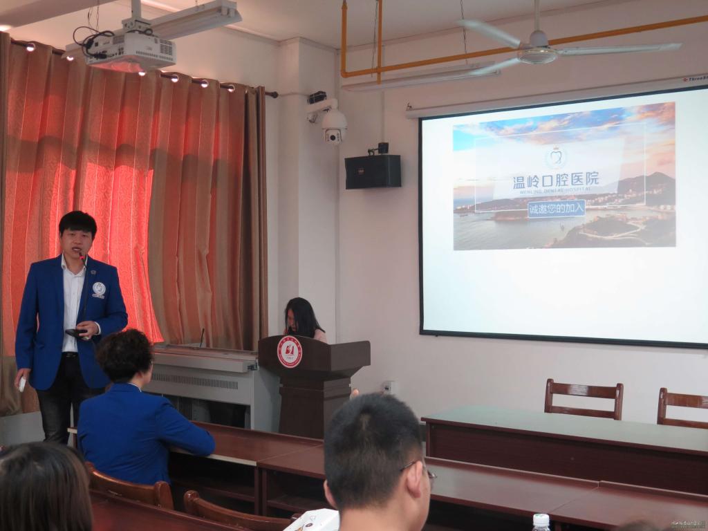 宣讲会伊始,肖主任首先对宣讲嘉宾表示了热烈的欢迎,随后,两家医院代表分别对学生的实习需求、招聘与选拔方式等进行了详细的宣讲,同时结合自己的工作经历分享了他们的就业经验。温岭口腔医院负责人说到,当今医疗形势严峻,社会对医务人员的要求也越来越全面,只有文凭是不够的,应聘者还需具备良好的综合素质,真正做到理论与实践结合,才能更好地适应今后的工作。枣阳东盛口腔医院主讲人还向在场学生详细解读了行业情况,深度分析口腔医学需求类型排名以及医院对于实习人才的需求分析,对我院毕业生的实习就业具有实际的指导意义。