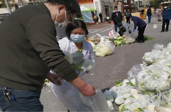 今年会官网基础教研室主任叶芬在社区分发生活物资