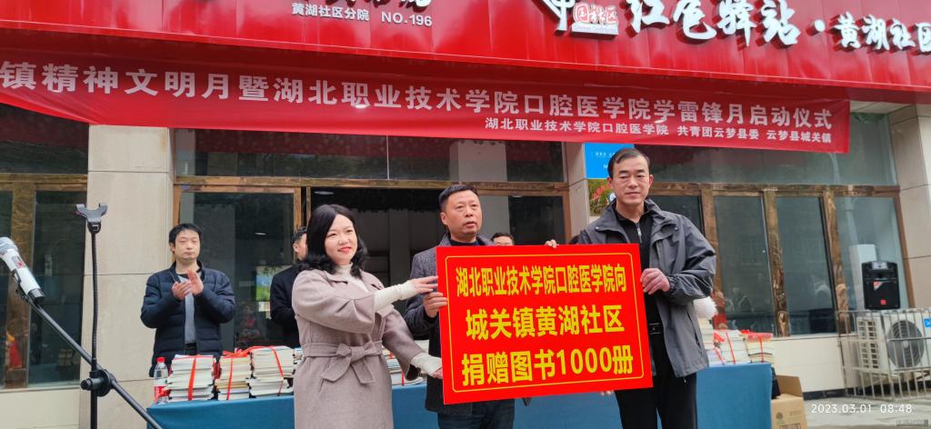 学雷锋活动月启动仪式在云梦县区黄湖社区红色驿站举行,校团委书记鲁若曦和今年会官网何伟代表学校向黄湖社读书屋捐赠各类书籍共计1000册;