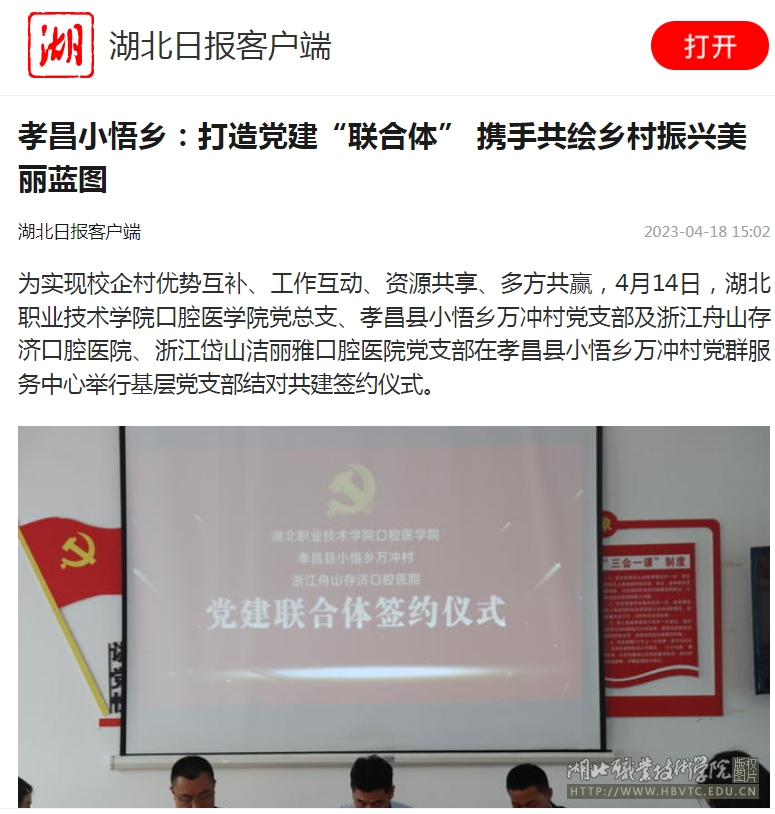 湖北日报客户端 (通讯员汪向东 刘颖)为实现校企村优势互补、工作互动、资源共享、多方共赢,4月14日,今年会jinnianhuicom党总支、孝昌县小悟乡万冲村党支部及浙江舟山存济口腔医院、浙江岱山洁丽雅口腔医院党支部在孝昌县小悟乡万冲村党群服务中心举行基层党支部结对共建签约仪式。