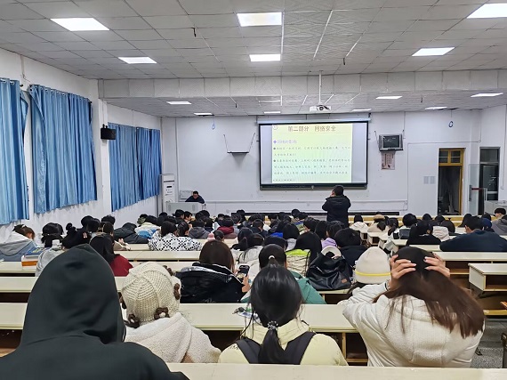 邹老师首先介绍了校园安全的重要性,让新生充分提高安全意识和重视安全问题,树立安全第一的准则。接着他围绕公共安全、网络安全、消防安全、交通安全等各个方面展开叙述,并结合校园真实案例,向同学们讲解了大学生易见多发的典型诈骗、火灾、交通安全、盗窃案例以及防范策略。最后,他强调同学们一定要悉知校园报警电话号码,遇到紧急情况要保持沉着冷静,并及时进行电话报警。