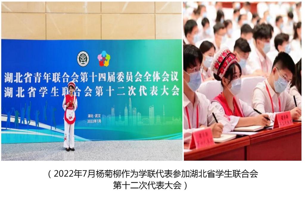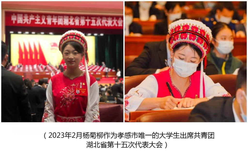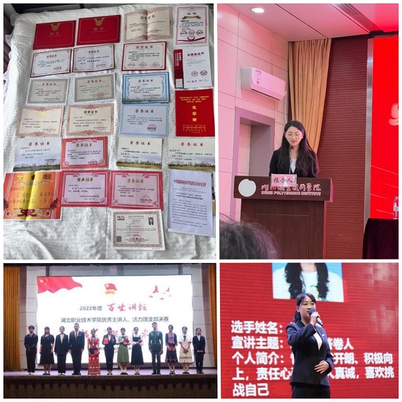 “党旗所指,团旗所向”是她对青春最好的定义。2022年7月,她当选了湖北省学生联合会第十二次代表大会。同年11月,她又参加团省委组织的“荆楚英才学校”湖北省大学生骨干培训班培训,学习研讨如何宣传贯彻党的二十大精神,以及习近平新时代中国特色社会主义思想。为期一年的培训顺利结业,她获得了“优秀学员”称号。2023年2月,她又作为孝感市代表团中唯一的大学生出席了共青团湖北省第十五次代表大会,在20岁就出席了两次省级青春盛会,代表孝感青年发声,与她而言是责任,更是担当。在担任学院团总支副书记期间,多次协助老师开展“强校有我在行动”等系列服务活动,带领各级团学干部通过宣讲、团课、板报等方式展开学习,动员参与“百生讲坛”、红歌赛、建团百年、“学雷锋”等系列活动,紧紧将广大团员同志凝聚在党的周围,发挥共青团的先进性,力求“心往一处想,劲往一处使”,获“五四红旗团总支”等称号。个人先后获全国、全省“大学生自强之星”、孝感市“最美孝德青少年”、孝感市马拉松“优秀志愿者”、校级“优秀共青团员”、“最美女大学生”等20余项国家级、省市级荣誉称号。