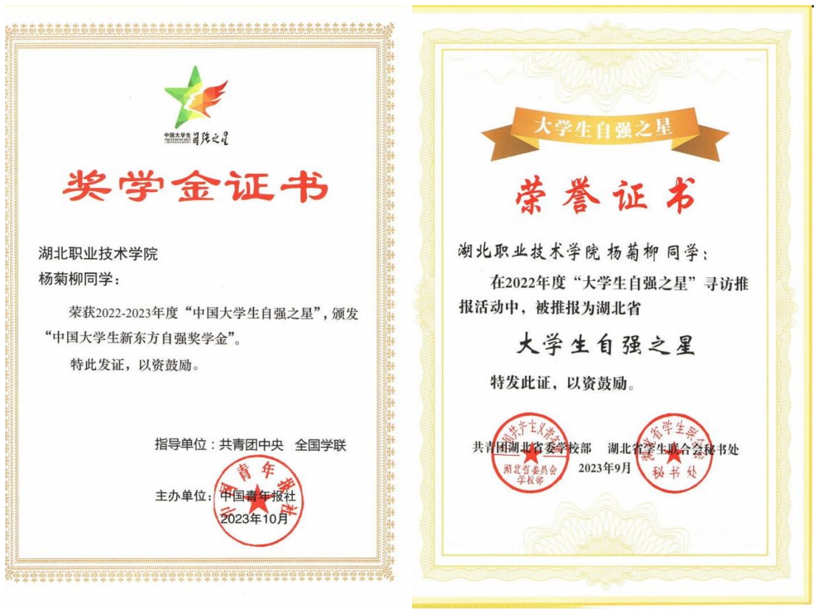 “知不足而奋进,望远山而前行。”这是杨菊柳的座右铭。自2021年入学起,她便下定决心,期望能够通过参加各类演讲比赛提升自己的表达能力。为了提高自己的舞台经验,她开始了疯狂的“训练”模式,利用所有的课余时间参加各类活动比赛、不断重复练习。“我不知道十一点钟回宿舍是什么感觉,很想看看宿舍楼亮灯的样子。”她经常为了改稿子、做PPT深夜才回宿舍,大家都已经酣然入梦,她蹑手蹑脚地走进宿舍,生怕发出声响,吵醒室友。星光不问赶路人,时光不负有心人。在她的不懈努力下,她获得了2021年大学生“孝道中国”演讲比赛一等奖、孝感市“中华魂”演讲比赛三等奖、2022年今年会jinnianhuicom“百生讲坛”优秀主讲人获“金牌主讲人”称号。