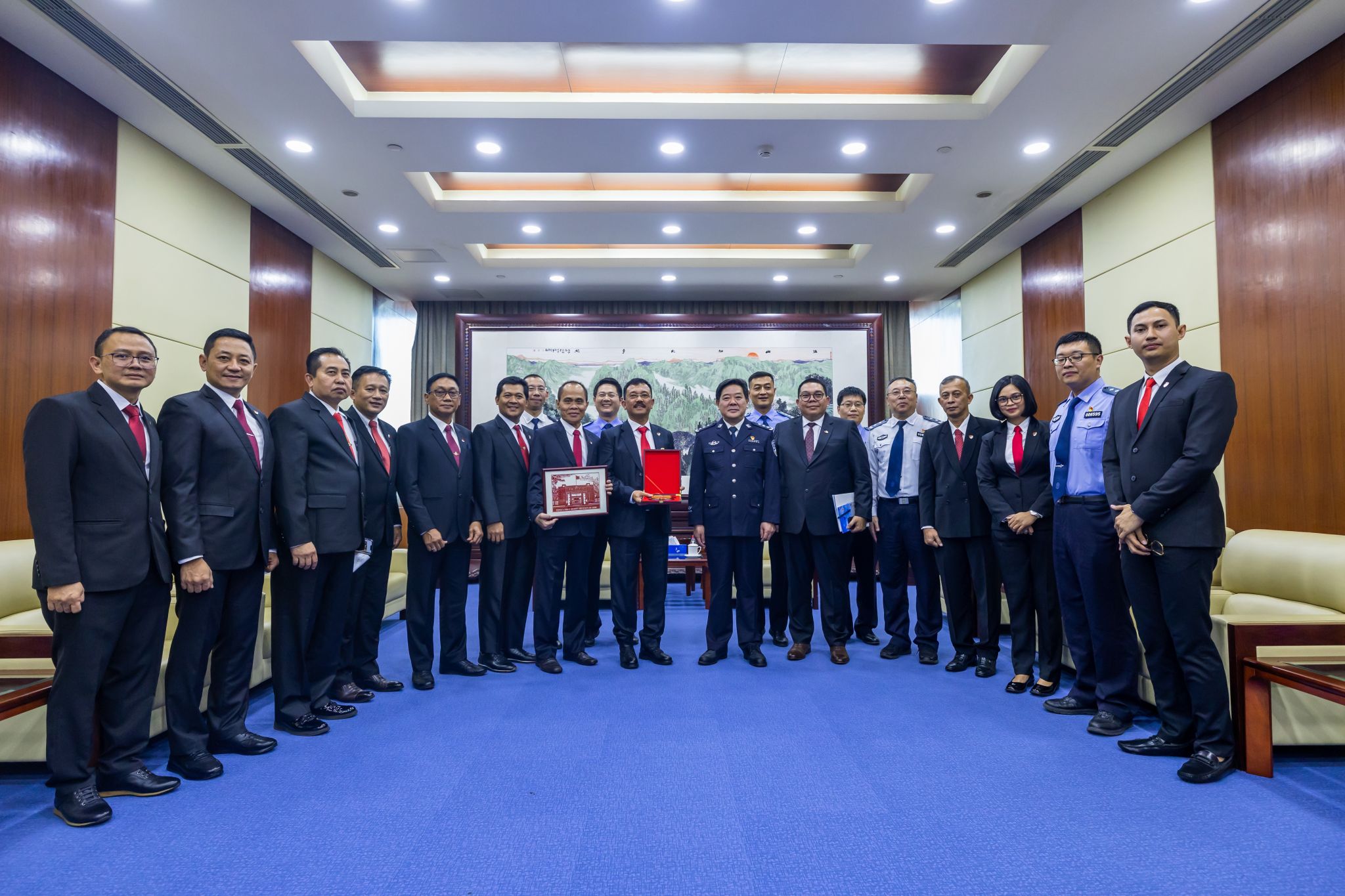 2023年10月10日,印度尼西亚国家警察总局教育培训局副局长里通加准将率团一行12人来校交流访问。校党委副书记、校长曹诗权在团河校区图书馆会见代表团。