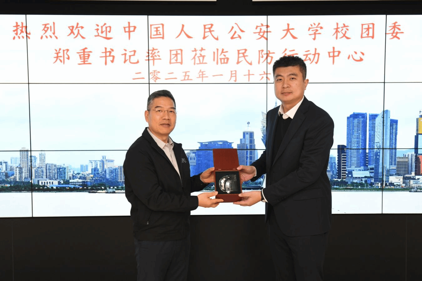 1月16日下午,参访团一行来到澳门保安司警察总局,参观考察警察总局民防行动中心,警察总局民防研究策划及行动协调厅厅长李志辉等陪同考察。参访团一行在中心指挥大厅先后了解了澳门保安司警察总局及民防行动中心的组成架构和工作模式,学习澳门民防体系联络机制、综合预警、应急联动和响应工作经验,参观民防行动中心工作场所,并互赠礼物。