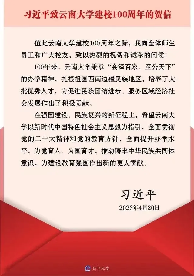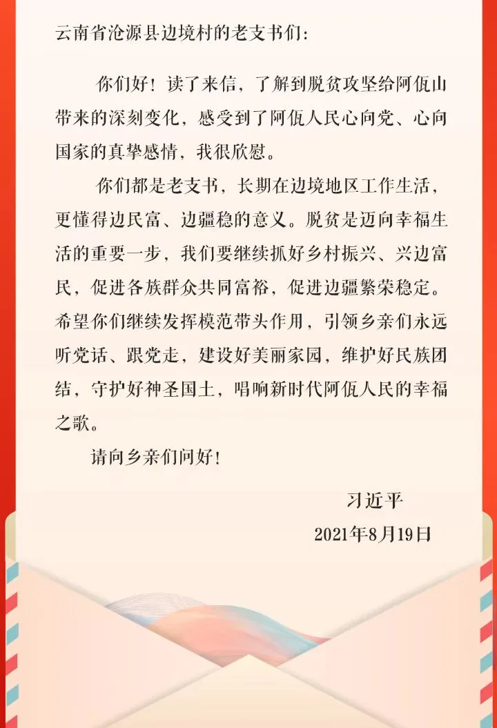 信中,习近平总书记高度评价玉麦乡牧民坚守祖国边陲,传承爱国守边精神;充分肯定独龙江乡脱贫奔小康,书写新时代的奋斗篇章;热烈赞扬沧源边境村老支书们带领乡亲脱贫攻坚,巩固边疆稳定与繁荣;鼓励云南大学继续扎根云岭大地,为民族团结与区域发展贡献力量;勉励公安大学英烈子女承袭父辈遗志,坚定理想信念做党和人民的忠诚卫士。