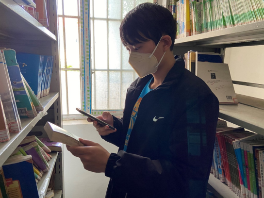 图为研支团成员韩张琛进行开学前图书扫描整理