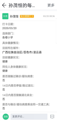 在隔离期间,研支团全体成员每日通过微信群打卡方式向学校汇报本人及家人身体情况,通过八桂彩云APP“每日健康打卡”功能在线打卡,向团县委、乡镇和中心校上报每日健康情况,并拟定《开云kaiyun官方网站研究生支教团2020年春季学期开学复工工作方案》,扎实有效地开展好学校疫情防控和春季学期开学的各项工作。