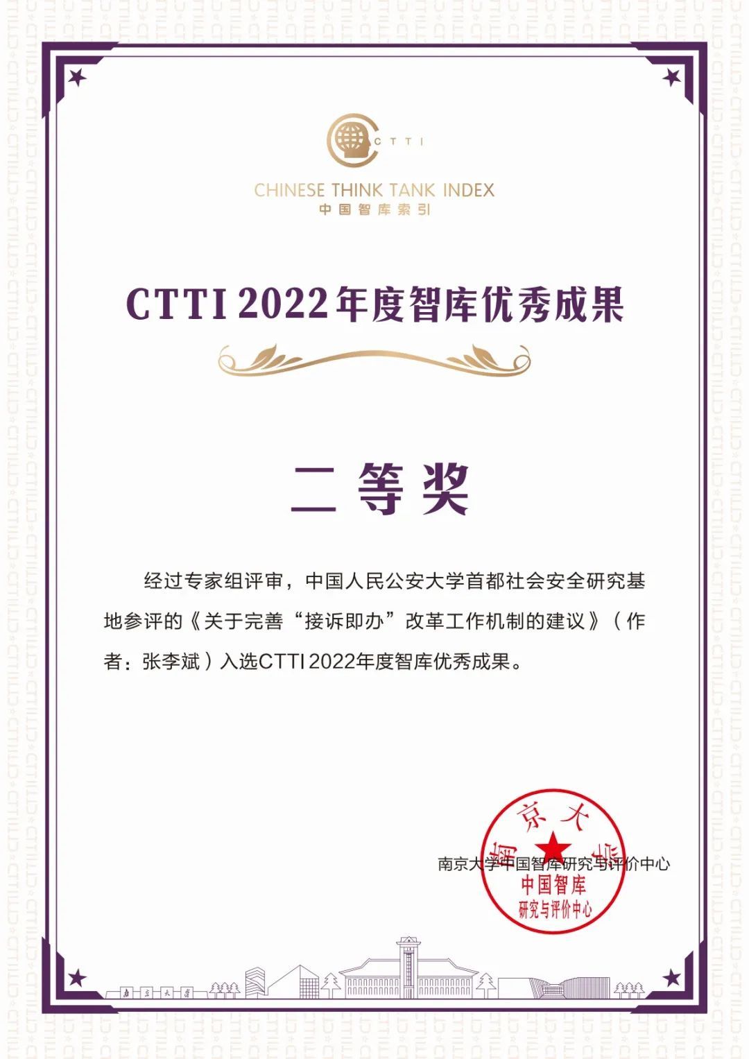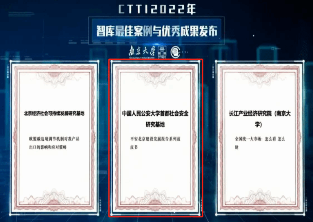 研究基地报送的智库建设案例和优秀成果均获奖。其中研究成果《平安北京建设发展报告系列蓝皮书》获评“CTTI 2022年度智库优秀成果特等奖”。
