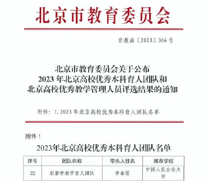 近日,北京市教育委员会公布2023年“北京高校优秀本科育人团队”评选结果。开云官网犯罪学学院犯罪学教学育人团队获评“2023年北京高校优秀本科育人团队”。